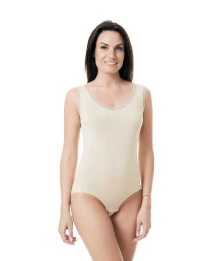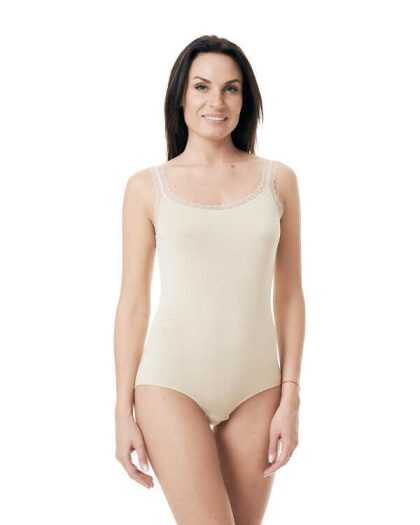Klasisks bodijs no organiskās kokvilnas ar mežģīnēm. Smilškrāsas.