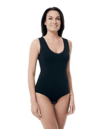 Klasisks bodijs no organiskās kokvilnas ar mežģīnēm. Melns.